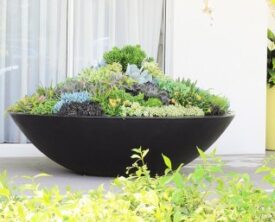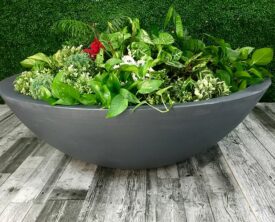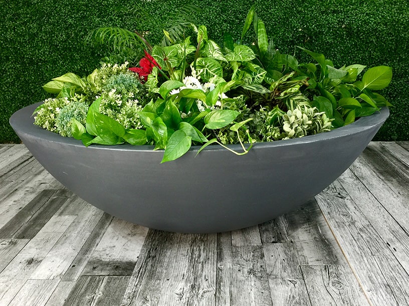 The Silhouette Low Bowl planter has a unique contemporary low profile that creates a colorful impact without blocking sight lines. Boasting over 15 square feet of planting area makes it the perfect choice for showcasing plant arrangements. Crafted in North America from UV protected thick gauge polyethylene, the Silhouette low bowl is resistant to all weather related cracking and fading even in the harshest of environments. It features drain free winterization, and thanks to our leading self watering technology there is never a risk of over or under watering. A perfect balance of design, durability, and functionality.